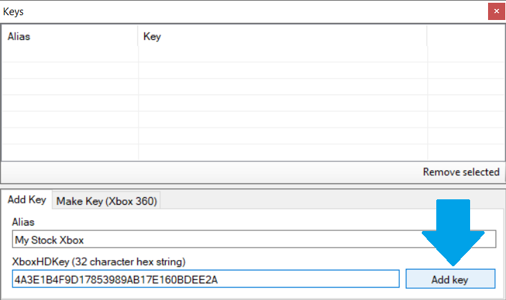 a) Once you have your 32 digit HDDKey file capitalized with spaces removed, add it to the key database in XBX Content Tool by clicking "Keys" adding an alias for your console and adding the 32 digit key, then clicking "Add key".
