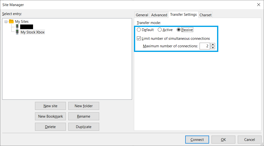 a) Using the IP address on the bottom right of your blue UnleashX menu, make an FTP site entry in your FTP client. IP is the xbox IP, port is 21, username and password are both "xbox". If possible in the Transfer Settings tab set your transfer setting to Passive mode, limit connections to 2, and in Settings\FTP:File Types set transfer type to Binary.