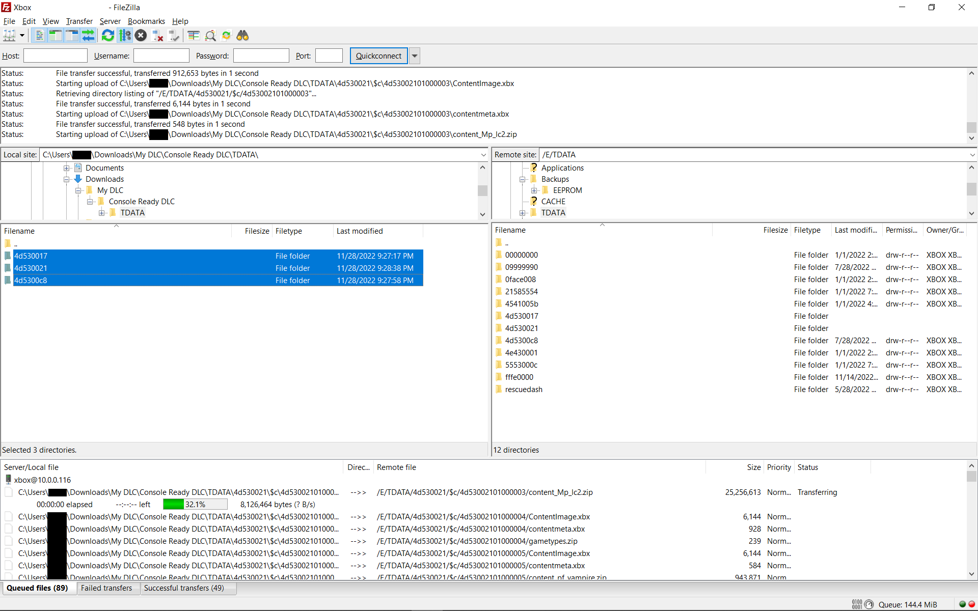b) Using your FTP client; copy the files to the correct E:/TDATA/ folder for each game you prepared DLC for, wait for all file transfers to complete fully.